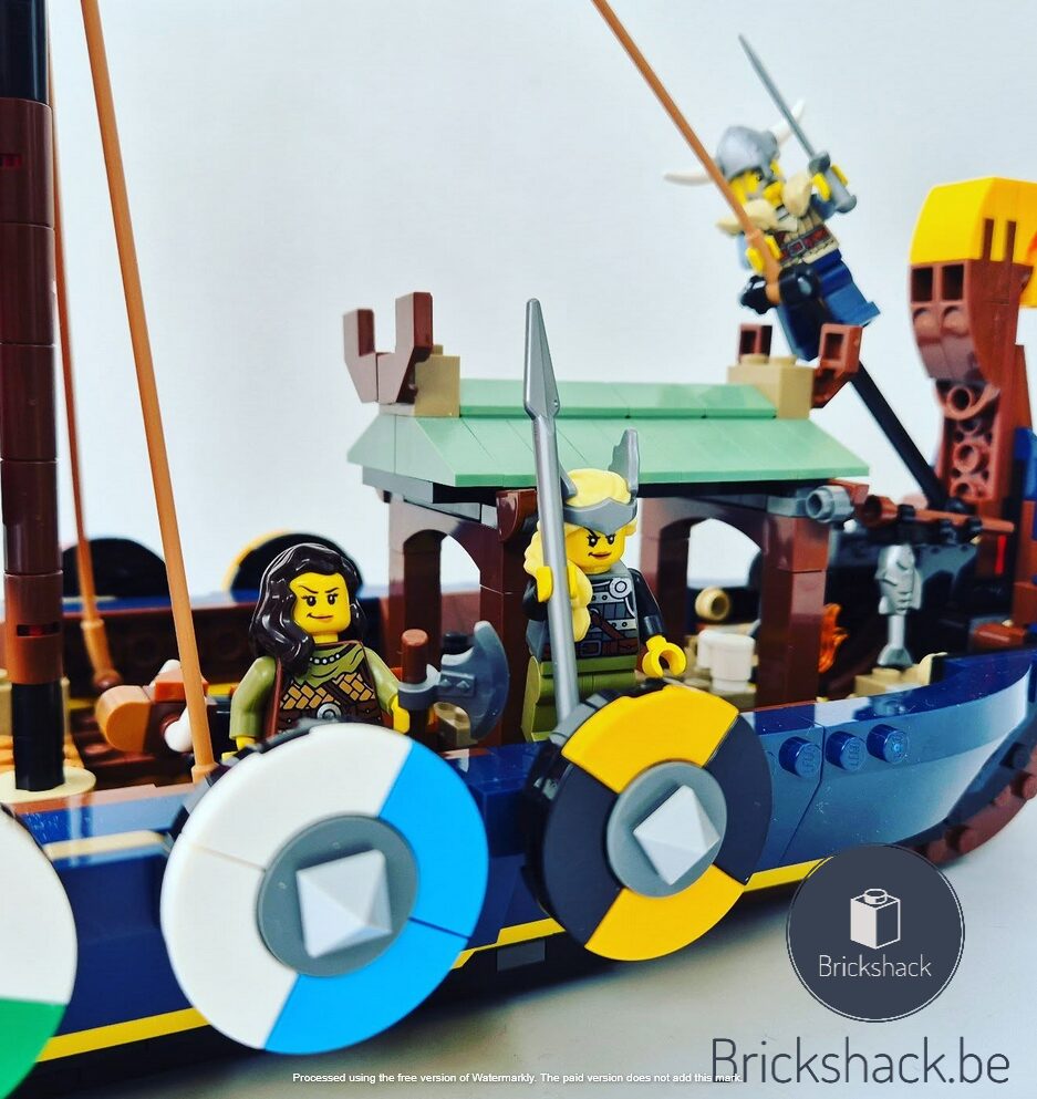 Dit model van een traditioneel Vikingschip heeft 8 schilden, een noppenschietende katapult, een koe en 2 raven van LEGO stenen en een verstelbare Midgaardzeeslang voor leuke verhalen.